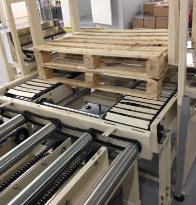 自動拆分木棧板輸出,自動拆分紙板放木棧板上,輸送到主線體,包裝好的產品通過XYZ三軸自動機械臂碼放到棧板上,碼放數量完成,自動輸送到后段線